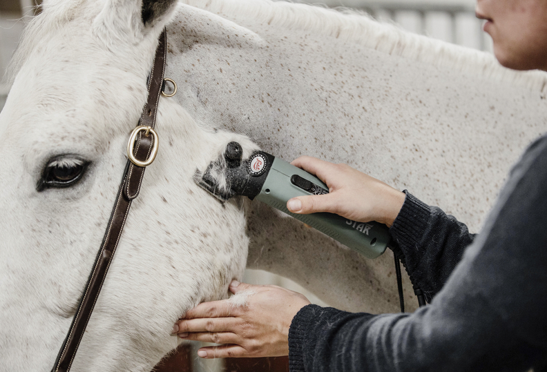 Avant de passer la tondeuse, on la passe en position « off » sur le corps de notre cheval pour s’assurer qu’il n’en ait pas peur. Petite astuce pour désensibiliser nos chevauxà la tondeuse : nous pouvons passer une petite brosse à dents électrique sur leur corps fréquemment avant le jour J pour les habituer aux bruits et aux vibrations.